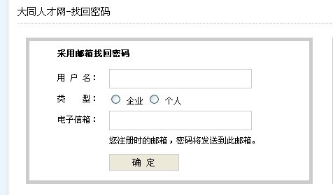 請輸入 用戶名 和當(dāng)初注冊的郵箱.特別注意,選擇好,企業(yè)和個人,企業(yè)就是招聘單位,個人就是求職者 填寫完畢 點確定 就可以了,如果這個方法不好用 可以用下一個,.